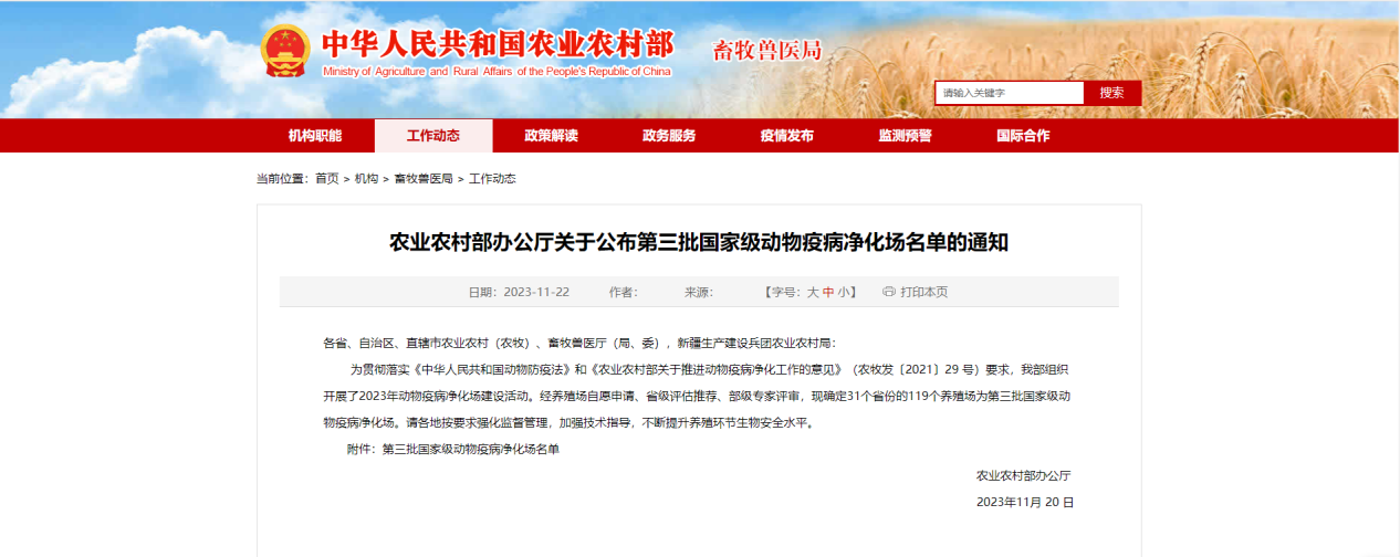 11月20日,農(nóng)業(yè)農(nóng)村部辦公廳發(fā)布第三批國家級動物疫病凈化場名單(農(nóng)辦牧﹝2023﹞29號),我司經(jīng)部級專家評審,被評為國家級羊布魯氏菌?。ǚ敲庖撸﹥艋瘓觥?/p>